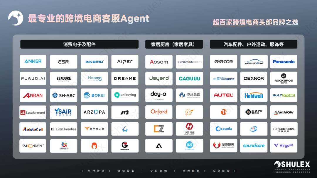 “能落地,真有效”的背后,是 Shulex 对于跨境细分行业的深度经验积累。服务Anker、元鼎、库犸、PLAUD等100+ 头部跨境品牌,将家具家居、智能家电、汽摩配等垂直行业 Know-how 转化为 200+ 电商行业Agent。